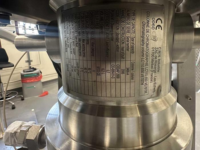 ATEX II 3 IIBT4 Preparative HPLC system consisting of a NOVASEP HIPERSEP LAB module 0 to 70 bar, a PROCHROM LC110.650.VE70 axial compression column with a diameter of 11cm, feed pumps, 10 valve manifolds that allow the splitting of feed and product flows. With GECMA CHALLENGER 18i mobile control panel, SCADA program version: 1913.4.2, PLC program version: 1913.6.2, with utensil trolley, suitable for 5 and 11 cm column.